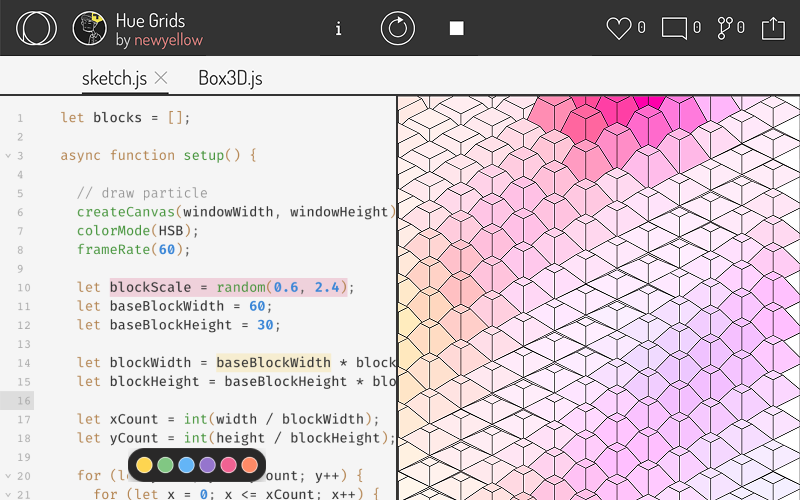 Code away your ideas in P5js, discover new libraries, create your portfolio and share your work.